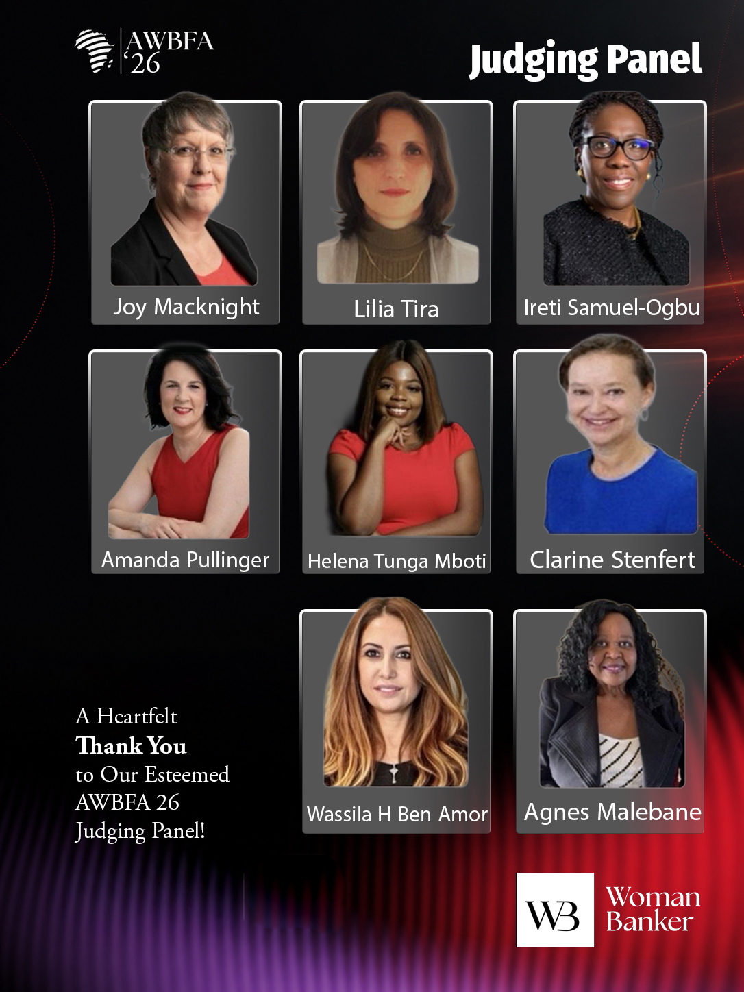 A special recognition goes to Joy Macknight, whose exceptional leadership has guided this process with unparalleled professionalism. With her extensive experience, having previously chaired the prestigious Awards of The Banker under Financial Times, Joy has brought a wealth of knowledge and integrity to AWBFA 26. Her vision and commitment have set a benchmark for excellence, ensuring a fair and inspiring awards journey for all.